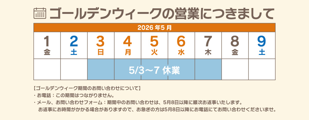 受付時間: 9:00~18:00 (定休日:火曜日/水曜日)