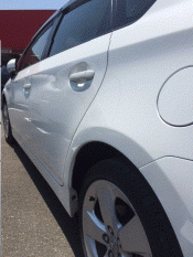 | 修理担当者のコメント | 鈑金修理とコーティングで3台を当店にお任せいただいて いるお客様です。とてもありがたく思っています。 今回も満足していただきました。ありがとうございます。 プレスラインと呼ばれる形の真上についたヘコミとキズです。 軽度なヘコミだったので引き出し作業はせずにパテでの 作業のみとなりました。塗装はドア1枚です。 |
